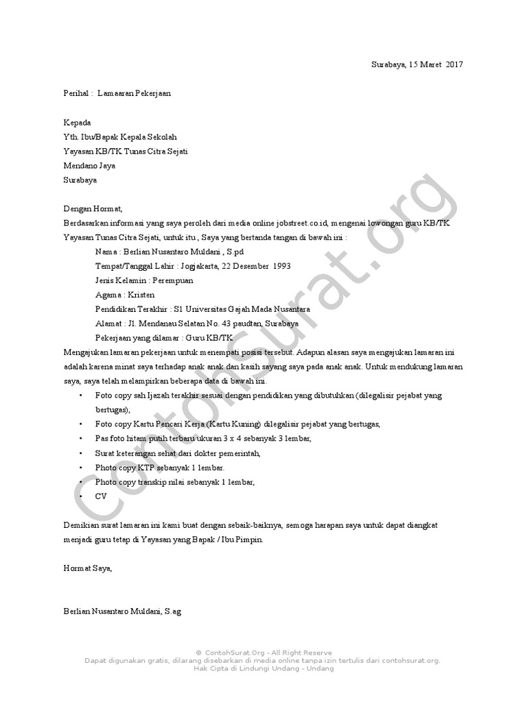 Surat lamaran kerja yang anda buat sangat berpengaruh dengan peluang anda diterima di besar harapan saya agar bapak/ibu dapat menerima saya menjadi guru tetap di yayasan yang bapak/ibu pimpin. Mungkin secara materi penghasilan menjadi guru tidak seberapa, namun bagi mereka yang berambisi menjadi guru yaitu justru lebih kepada manfaat mengamalkan. Dewasa ini karena perkembangan ilmu pengetahuan yang semakin maju jenis pekerjaan yang bisa dilakukan seseorang semakin beragam. Namun, anda tidak perlu merangkai kosakata lagi karena ada beberapa contoh surat lamaran yang dapat menjadi guru tk, kesabaran dan ketelatenan adalah modal utama. Surat lamaran dibawah ini bisa juga sobat ganti menjadi bahasa inggris lalu di print atau di tulis tangan.